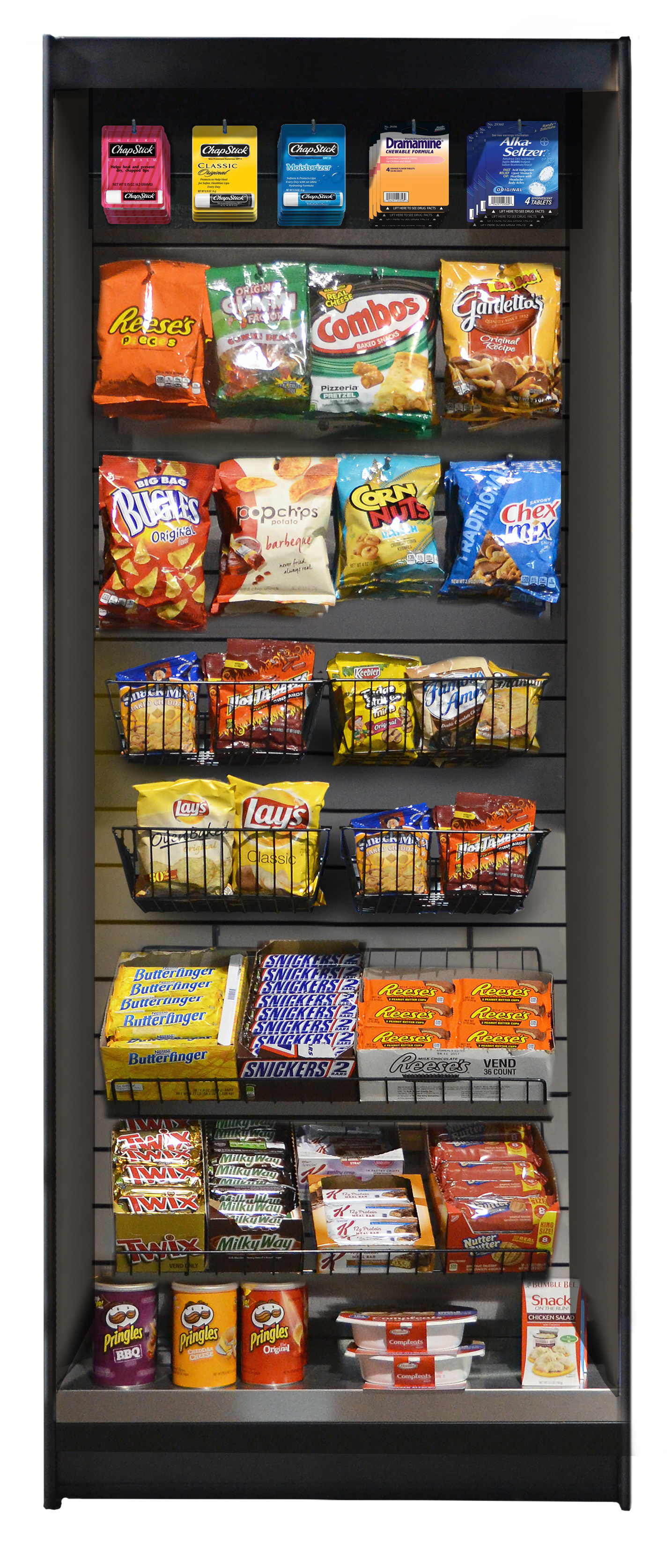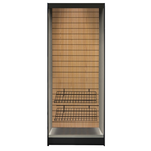 This sleek new stand lets you put lots of products in your micro market. If limited space is a concern this stand may be just what you need. The LED light will enhance product viewing. A choice of slat wall look, it is available in stainless steel, vinyl-clad oak, or vinyl-clad walnut. Also a choice of black or platinum color on the inner walls. Lots of display space (12 square feet) in a stylish sturdy cabinet. One LED light is included. The bottom shelf is stainless steel. Display kits pictured are not included and must be purchased separately.