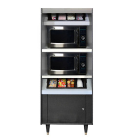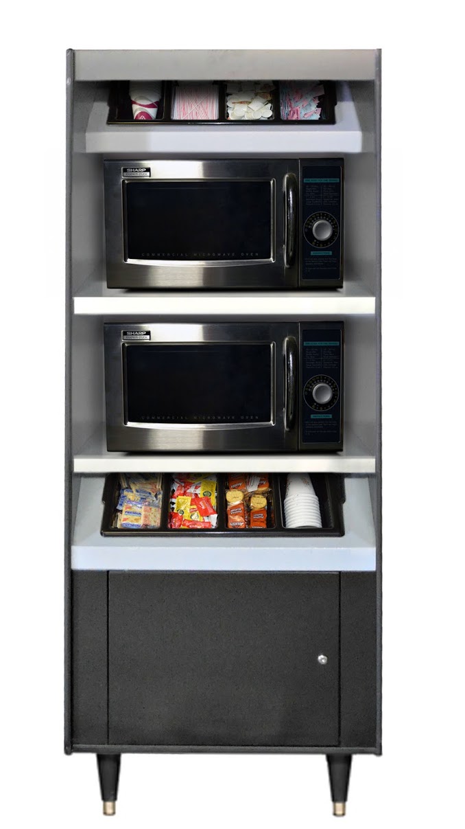 Lighted Condiment stand for up to 2 microwaves, with 2 trays for condiments. Fits snugly between vending machines. Equipped with 20-amp receptacles to accommodate 2 microwaves.