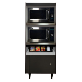 Lighted Condiment stand for up to 2 microwaves, with condiment tray plus storage. Fits snugly between vending machines. Equipped with 20-amp receptacles to accommodate 2 microwaves.