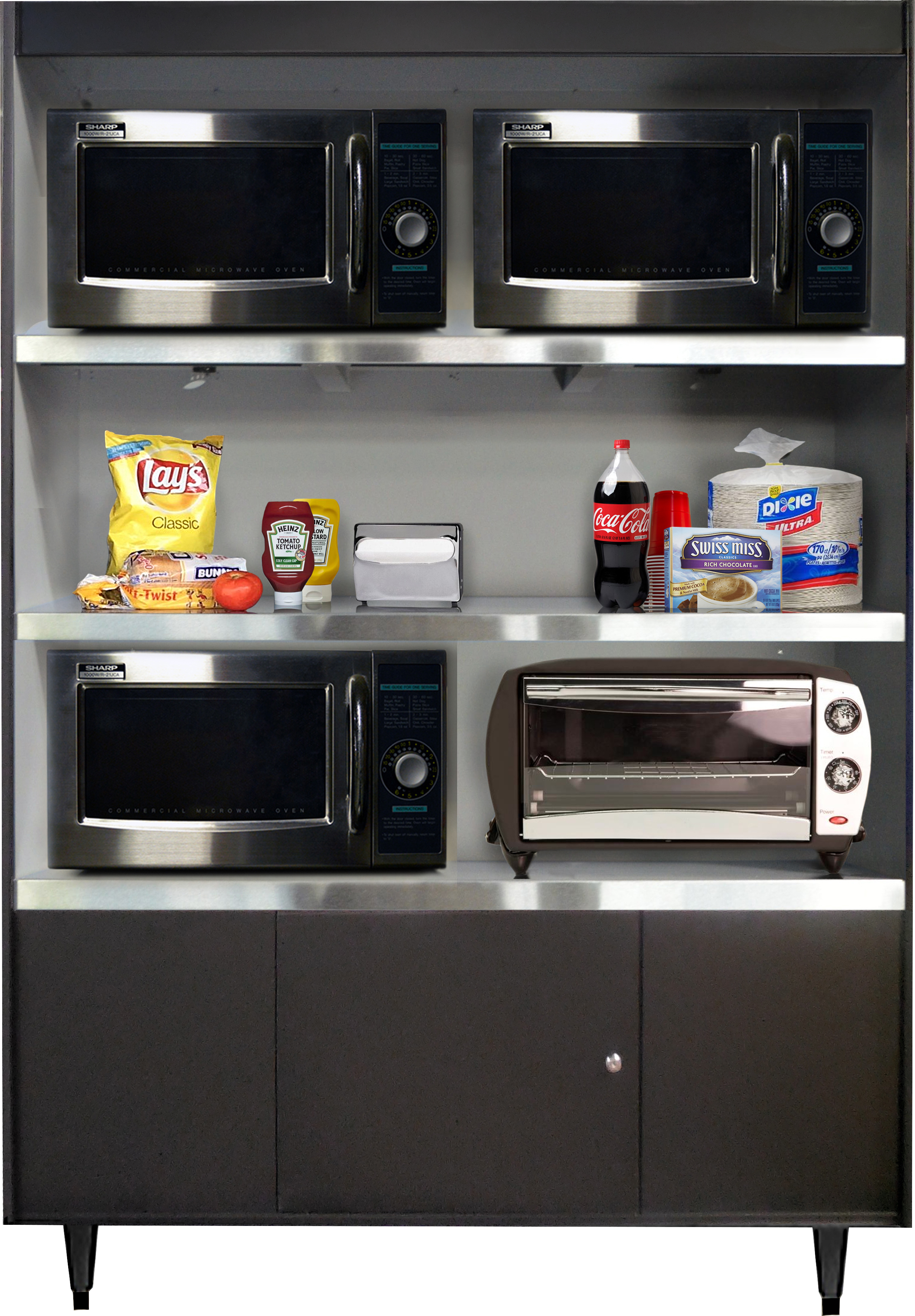 The ultimate space saving condiment stand. This unit with three stainless steel shelves will hold up to 6 microwave ovens. There is still plenty of room for bulk storage down below. Use your creative skill to configure as you see fit. Non-Lighted Unit feature 20-amp receptacles and can accommodate up to 6 microwaves. Includes bulk Storage down below.
