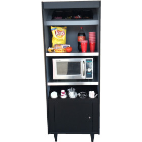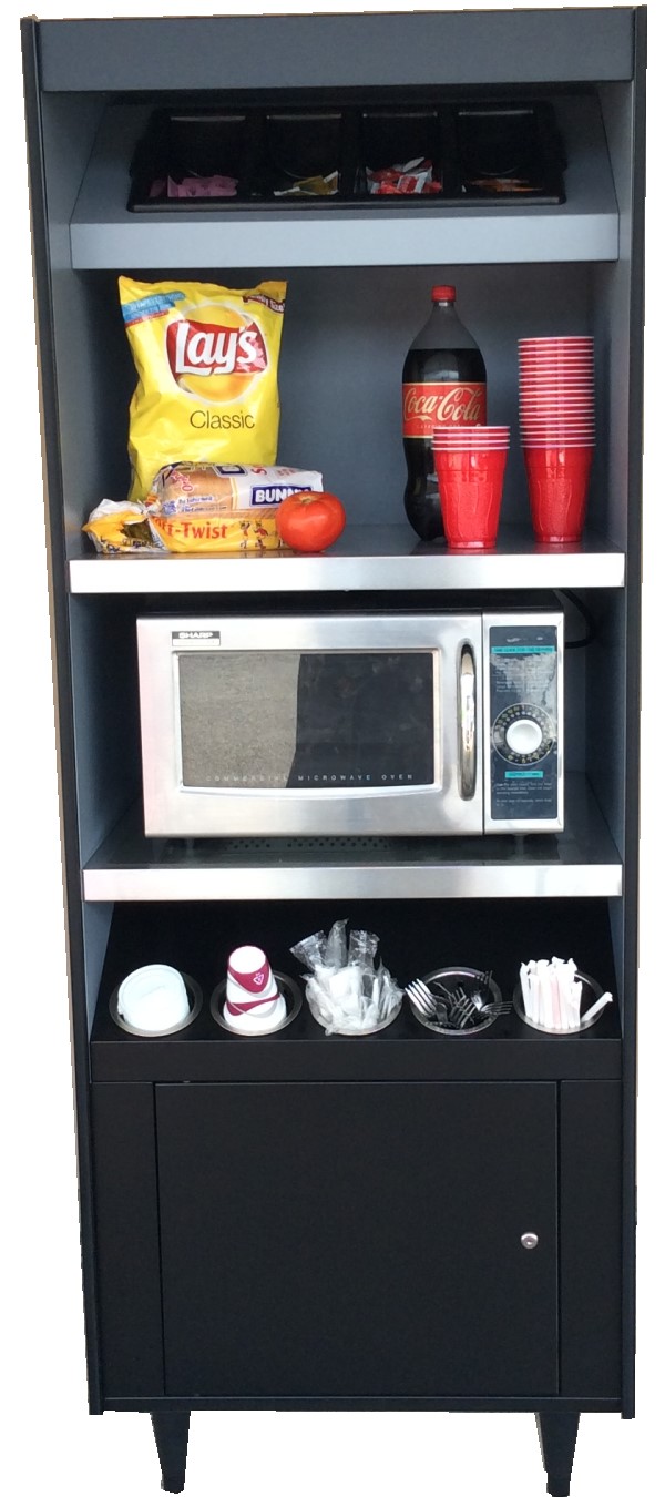 Condiment stand for up to 2 microwaves, with condiment tray plus storage. Fits snugly between vending machines. Equipped with 20-amp receptacles to accommodate 2 microwaves.
