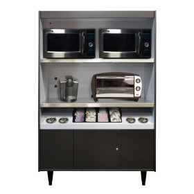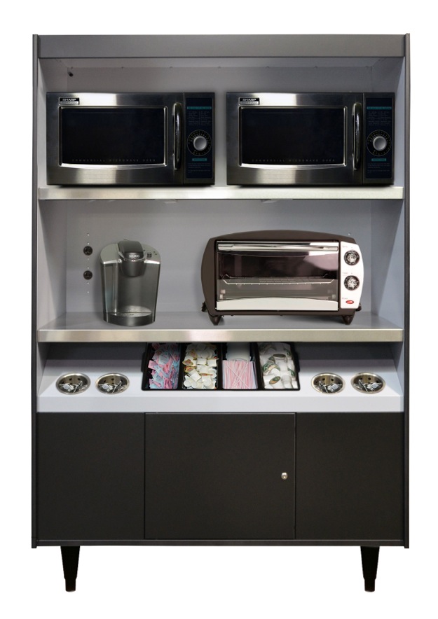 Condiment Stand for up to 4 microwaves and 4 Stainless Steel Cups. Units feature 20-amp receptacles and can accommodate up to 4 microwaves, or brewer, toaster ovens, etc. Includes 4 stainless steel condiment cups and a 4-section condiment tray. Double-wall metal construction. Durable vinyl-clad steel fronts. Stainless steel work shelves. Cabinet mounted, 20 amp receptacles (one per shelf). 12 foot electrical cords. Stain resistant gray interior. Bison Black.