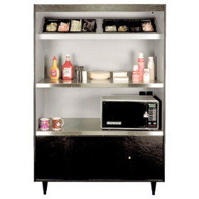 Condiment stand for up to 4 microwaves with Two High Trays. Units feature 20-amp receptacles and can accommodate up to 4 microwaves.