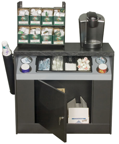 The OCS360 is our newest coffee stand, designed to be used with today's single cup coffee units and their merchandisers. We have added more condiment storage making the OCS360 the only OCS stand that has 8 condiment selections. The OCS 360 brings a rich, industrial geometry to the office. With the same boldness in steel, the new OCS 360 is a stunning home for your first class coffee system. There is an optional 8/12oz side cup holder, 006-ADJ-NW31. The shelf is for interior storage.