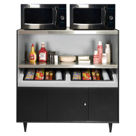 Flexible multipurpose unit with stainless steel shelves and 2 condiment tray. This low-top unit provides storage and counter top space for coffee brewers, microwaves and condiments. Short-stop 1/2-inch lip keeps items from falling off top. Includes 20-amp receptacles.