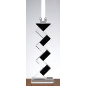 Angela Candlesticks 14" This mouth blown handcrafted Asian crystal pair is the cats meow! Modern and sophisticated its zig zag, clear and black crystal body of rectangular shapes climbs its way to an inverted black carriage that goes clear again to hold the candles. Mounted on a flat base the candles are begging to be lit. Romance is guaranteed!