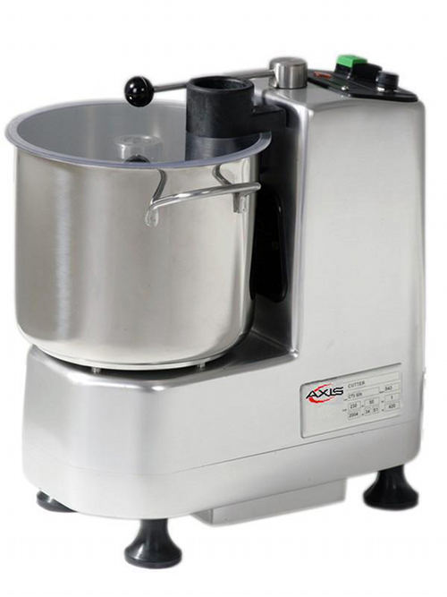 The Axis Equipment AX-FP15 food processor has a 0.5-horsepower 120V electric motor, a stainless steel bowl with a 6 qt. capacity, two cutting blades made of high-tempered stainless steel for strength, a clear plastic cover for visibility of contents and to help protect the contents during operation, and it is suitable for chopping meat, slicing vegetables, emulsifying liquids, kneading dough, mixing ingredients, and other food preparation. The cutting blades are positioned in two planes to facilitate different modes of operation such as chopping, slicing, and emulsifying. The basic working parts on this food processor are made of stainless steel to facilitate cleaning.