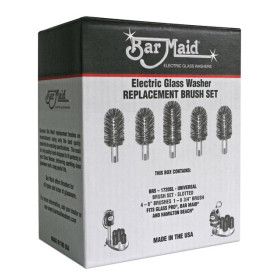 The Bar Maid universal electric glass washer replacement brush set includes four 6 inch brushes and one 6.75 inch brush. Packaged in a retail display box. Includes slotted brushes and locking pins. Fits all current models of Bar Maid, Glass Pro and Hamilton Beach electric glass washers.