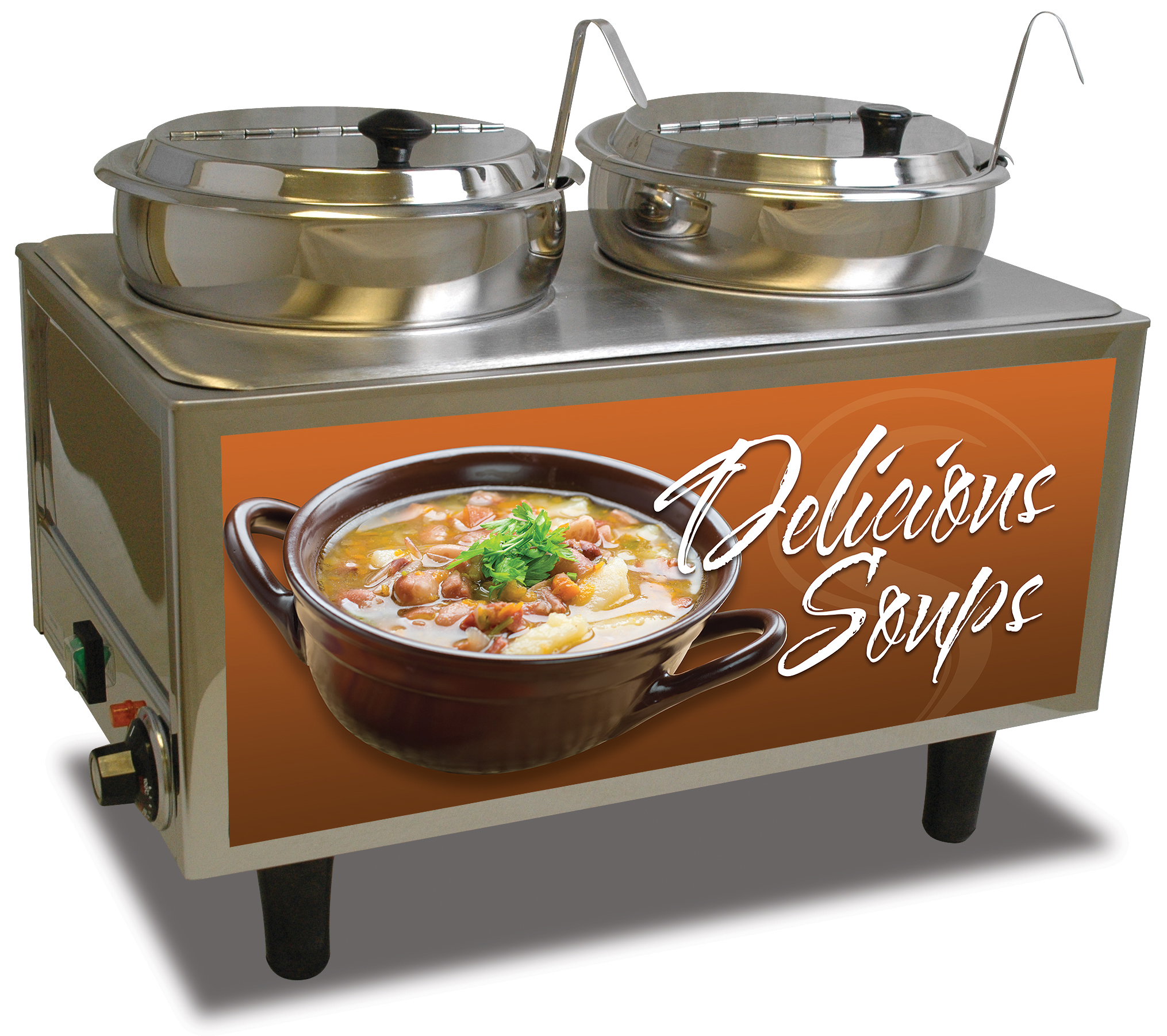 This dual well warmer is designed specifically for Soup Station Warmer. The twin 7 quart wells are ideal for the toppings and it comes complete with the hinged inset lids and two long-handled, 3 ounce, one-piece ladles.