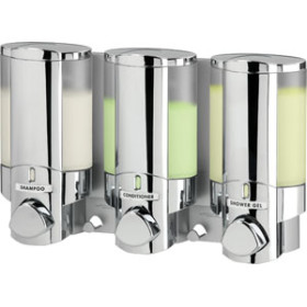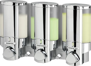 The AVIVA series of soap and shower dispensers are the most beautiful solution for bath and shower organization. An inspired combination of Design, Style and Practicality. Our three chambered models include integrated hooks to neatly store razors and accessories!p> Features: