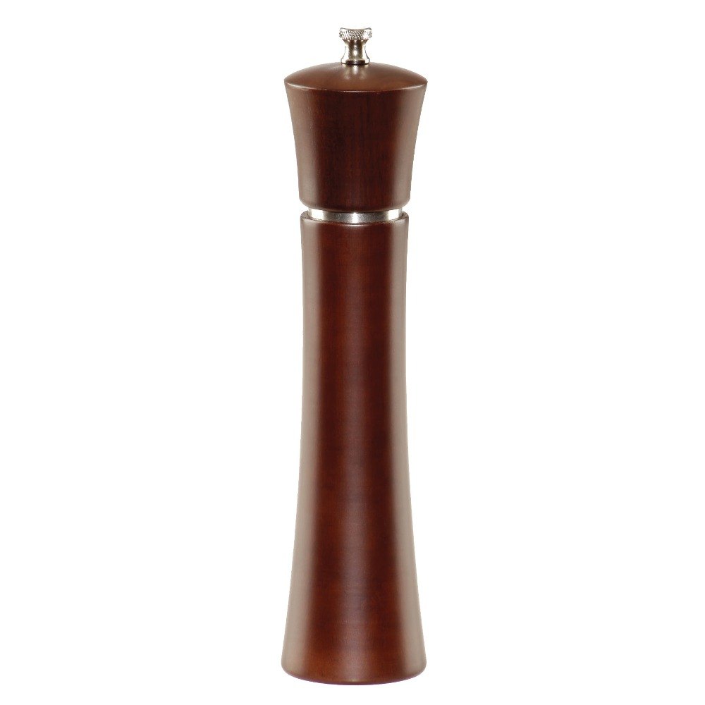This Chef Specialties 11880 Professional Series Pueblo pepper mill is simple yet sleek, and the perfect height for use around your kitchen. Standing 11" tall, it features a mocha cafe finish certain to match any decor. A brushed stainless steel band adds a bit of style and also acts as an integrated turnplate for years of use. Made in Western Pennsylvania, the Professional Series pepper mill grinding mechanisms are made from solid, cutlery-grade stainless steel to endure commercial use, and have been judged to be the world's best. The grinding mechanism is accompanied by a lifetime warranty so you don't have to worry about a faulty product. Due to their hands-on manufacturing process, Chef Specialties Professional Series are quality items considered to be the finest by many in the food service industry.