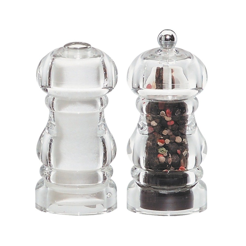 Clear acrylic 5 inch pepper grinder and salt shaker set with a tempered stainless steel grinding mechanism.