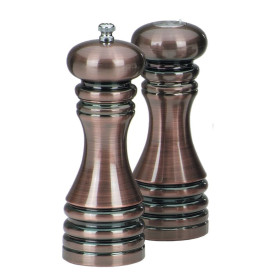 The 90070 7" Burnished Copper Pepper Mill and Salt Shaker Set is finished with a dark, burnish finish on an acrylic body.