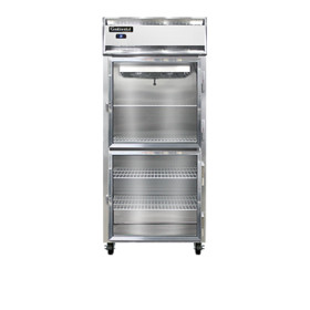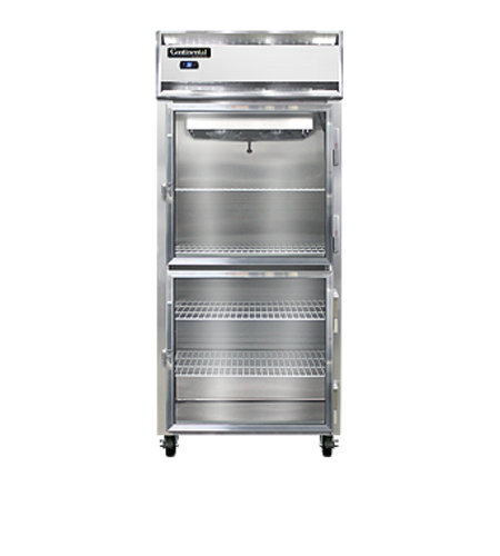 Extra-Wide Refrigerator, reach-in, 36-1/4" wide one-section, self-contained refrigeration, aluminum exterior & interior, stainless steel front, standard depth, extra wide half-height glass doors, electronic controller w/ digital display, electric condensate evaporator, 5" casters, 1/3 hp