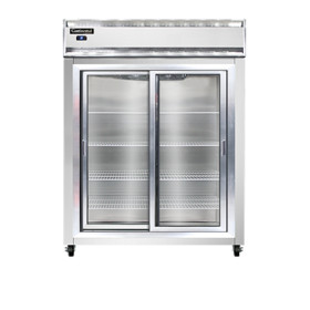 Extra-Wide Refrigerator, reach-in, 57" wide two-section, self-contained refrigeration, stainless steel exterior & interior, standard depth, full-height sliding glass doors, electronic controller w/ digital display, electric condensate evaporator, 5" casters, 1/2 hp