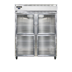 Extra-Wide Refrigerator, reach-in, 57" wide two-section, self-contained refrigeration, aluminum exterior & interior, stainless steel front, shallow depth, wide half-height glass doors, electronic controller w/ digital display, 5" casters, 1/2 hp