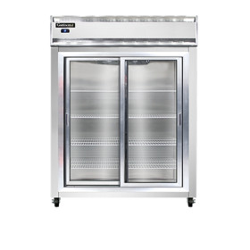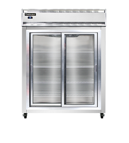 Extra-Wide Refrigerator, reach-in, 57" wide two-section, self-contained refrigeration, aluminum exterior & interior, stainless steel front, shallow depth, full-height sliding glass doors, electronic controller w/ digital display, 5" casters, 1/2 hp