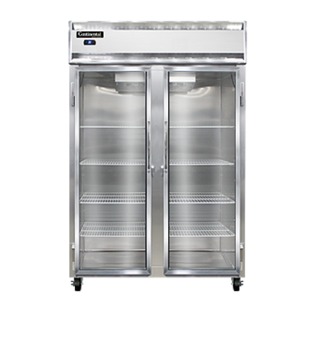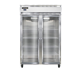 Refrigerator, reach-in display, two-section, self-contained refrigeration, stainless steel exterior & interior, shallow depth, narrow hinged glass doors, electronic controller w/ digital display, 5" casters, 1/2 hp