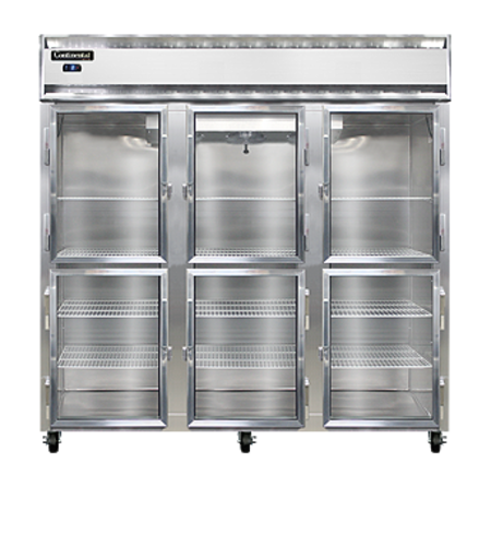 Freezer, display, three-section, self-contained refrigeration, aluminum exterior & interior, stainless steel front, standard depth, narrow hinged glass half doors, electronic controller w/ digital display, electric condensate evaporator, 5" casters, 1-1/2 hp