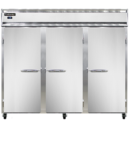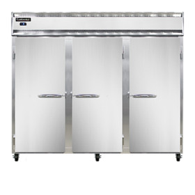 Extra-Wide Freezer, reach-in, 85-1/2" wide three-section, self-contained refrigeration, stainless steel front, aluminum interior & ends, standard depth, full-height solid doors, electronic controller w/ digital display, electric condensate evaporator, 5" casters, 3/4 hp