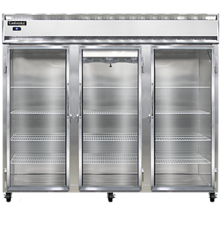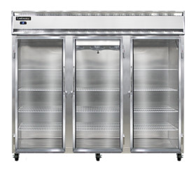 Extra-Wide Refrigerator, reach-in, 85-1/2" wide three-section, self-contained refrigeration, stainless steel exterior & interior, standard depth, full-height glass doors, electronic controller w/ digital display, electric condensate evaporator, 5" casters, 3/4 hp