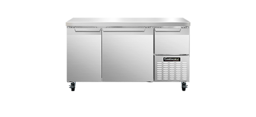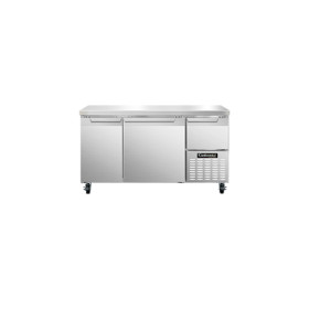 Refrigerated Base, 60" wide, #300 stainless steel flat work top, stainless steel front and end panels, galvanized steel rear and grill, aluminum interior, (2) full & (1) half height field rehingable doors, 5" casters, 1/3 hp, side-mounted refrigeration, NSF, CE, ETL