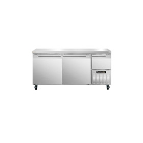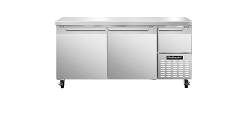 Refrigerated Base, 68" wide, #300 stainless steel flat work top, stainless steel front and end panels, galvanized steel rear and grill, aluminum interior, (2) full & (1) half height field rehingable doors, 5" casters, 1/3 hp, side-mounted refrigeration, NSF, CE, ETL