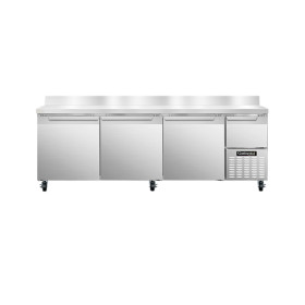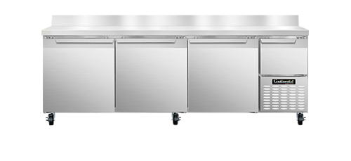 Refrigerated Base, 93" wide, #300 stainless steel work top with 5 1/2" backsplash, stainless steel front and end panels, galvanized steel rear and grill, aluminum interior, (3) full & (1) half height field rehingable doors, 5" casters, 1/3 hp, side-mounted refrigeration, NSF, CE, ETL