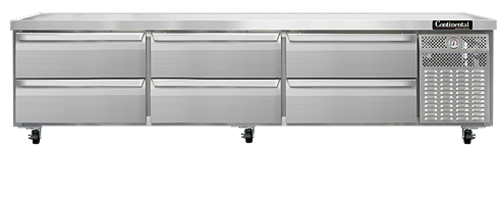 Refrigerator Griddle Stand, three-section, (6) drawers - six drawers accommodates (2) 12" x 20" x 6", dial thermometer stainless steel top with drip guard marine edge, stainless steel exterior and interior, 4" casters, self-contained refrigeration, 1/2 hp, 10' cord