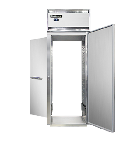 Designer Line Freezer, roll-thru, one-section, self-contained refrigeration, stainless steel front, aluminum interior & ends, standard depth cabinet, full-height solid doors, electronic controller w/ digital display, removable stainless steel ramps, 3/4 hp