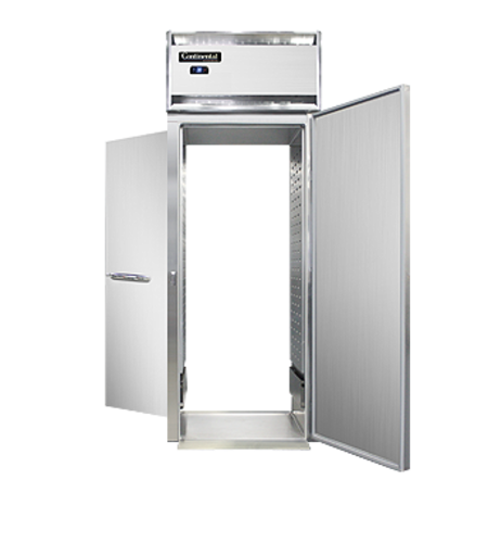 Designer Line Refrigerator, roll-thru, one-section, self-contained refrigeration, stainless steel front, aluminum interior & ends, standard depth cabinet, full-height solid doors, electronic controller w/ digital display, removable stainless steel ramps, 1/3 hp