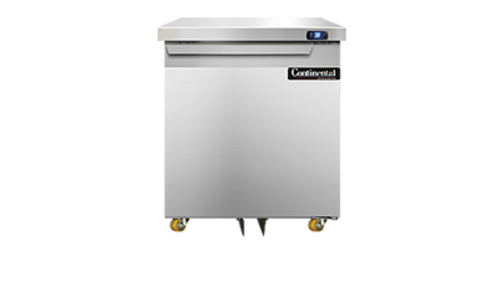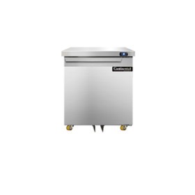 Designer Line Undercounter Refrigerator, 27" wide, one-section, (1) field rehingable door, stainless steel exterior & interior, stainless steel top, 1 3/8" diameter plate casters, front breathing, electronic controller w/ digital display, rear mounted self-contained refrigeration, 1/5 hp