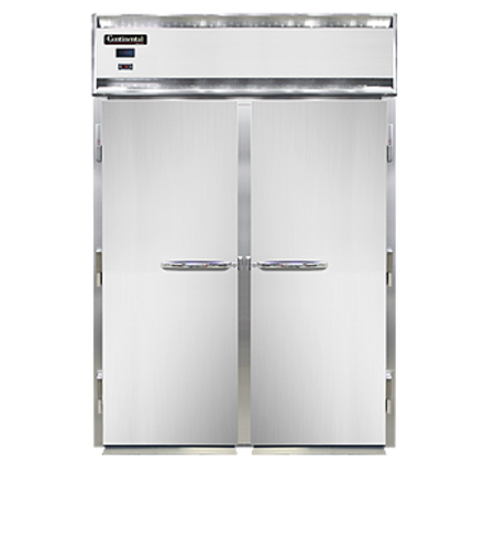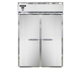 Designer Line Extra-High Freezer, roll-in, two-section, self-contained refrigeration, stainless steel front, aluminum interior & ends, standard depth cabinet, full-height solid doors, electronic controller w/ digital display, removable stainless steel ramps, 1 hp