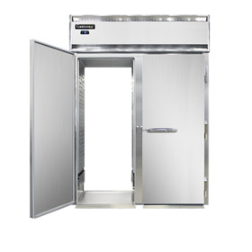 Designer Line Freezer, roll-thru, two-section, self-contained refrigeration, stainless steel exterior, aluminum interior, standard depth cabinet, full-height solid doors, electronic controller w/ digital display, removable stainless steel ramps, 1 hp