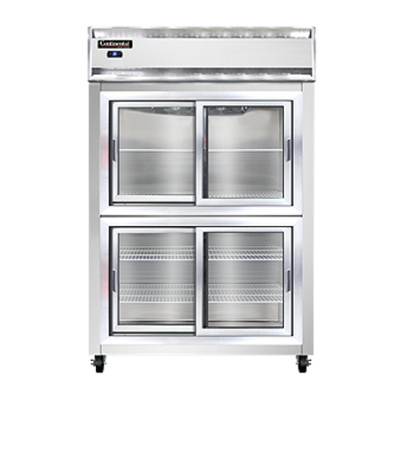 Designer Line Refrigerator, reach-in, two-section, self-contained refrigeration, stainless steel exterior & interior, standard depth cabinet, half-height sliding glass doors, exterior digital thermometer, 6" stainless steel legs, 1/2 hp