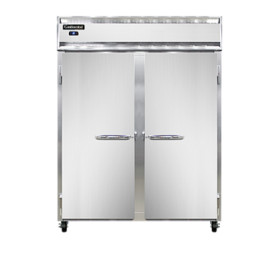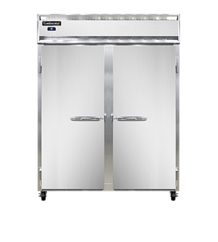 Designer Line Wide Refrigerator, reach-in, 57" wide two-section, self-contained refrigeration, aluminum exterior & interior, stainless steel front, shallow depth cabinet, wide full-height stainless steel doors, exterior digital thermometer, 6" stainless steel legs, 1/3 hp