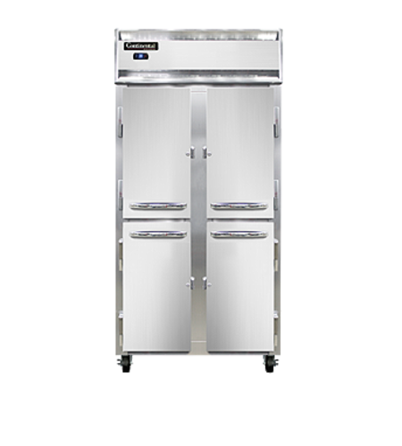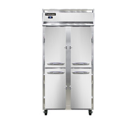 Designer Slim Line Refrigerator, reach-in, 36-1/4" wide two-section, self-contained refrigeration, stainless steel exterior & interior, stainless steel front, shallow depth cabinet, narrow half-height stainless steel doors, exterior digital thermometer, 6" stainless steel legs 1/4 hp