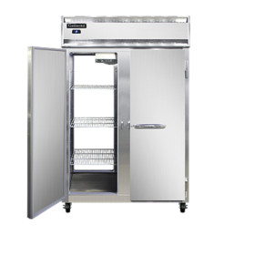 Designer Line Refrigerator/Heated Cabinet, pass-thru, two-section, self-contained refrigeration, aluminum exterior & interior, stainless steel front & doors, standard depth cabinet, narrow full-height doors, with exterior digital thermometer, 1/4 hp (refrigerator)