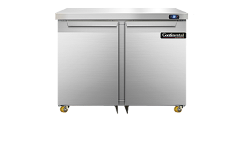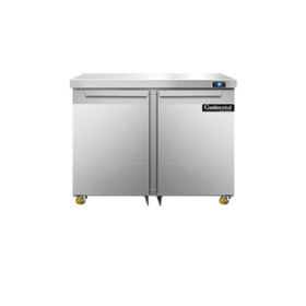 Designer Line Undercounter Refrigerator, 36" wide, two-section, (2) field rehingable door, stainless steel exterior & interior, stainless steel top, 1 3/8" diameter plate casters, front breathing, electronic controller w/ digital display, rear mounted self-contained refrigeration, 1/5 hp