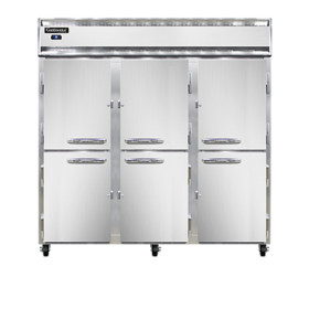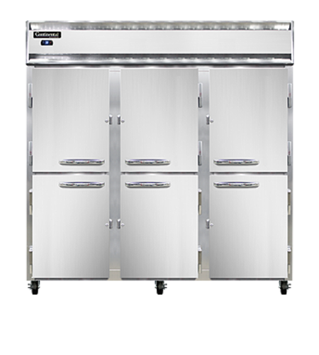 Designer Line Refrigerator, reach-in, three-section, self-contained refrigeration, stainless steel exterior & interior, standard depth cabinet, half-height stainless steel doors, exterior digital thermometer, 6" stainless steel legs, 1/2 hp