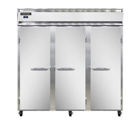 Designer Line Refrigerator, reach-in, three-section, self-contained refrigeration, stainless steel exterior & interior, standard depth cabinet, full-height stainless steel doors, exterior digital thermometer, 6" stainless steel legs, 1/2 hp