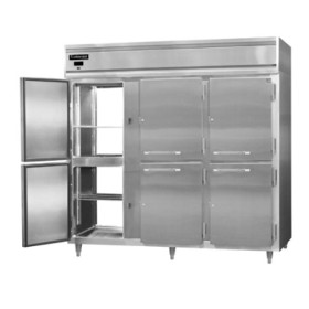 Designer Line Heated Cabinet, pass-thru, three-section, stainless steel exterior & interior, standard depth cabinet, narrow full-height doors, with exterior digital thermometer