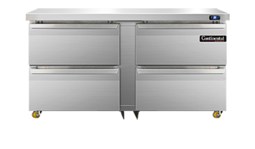 Designer Line Undercounter Refrigerator, 60" wide, two-section, (4) drawers, stainless steel exterior & interior, stainless steel top, 1 3/8" diameter plate casters, front breathing, electronic controller w/ digital display, rear mounted self-contained refrigeration, 1/4 hp