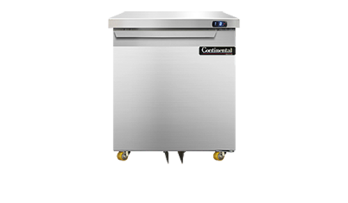 Designer Line Undercounter Freezer, 27" wide, one-section, (1) field rehingable door, stainless steel exterior & interior, stainless steel top, 1 3/8" diameter plate casters, front breathing, electronic controller w/ digital display, rear mounted self-contained refrigeration, 1/3 hp