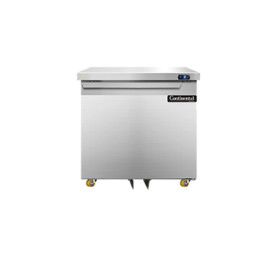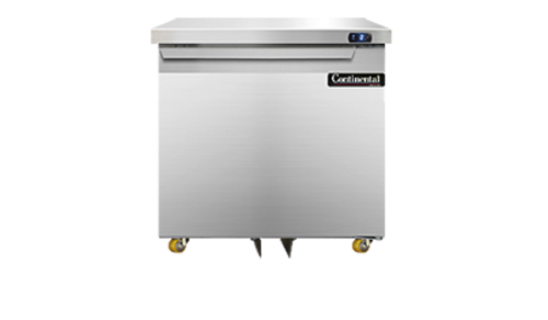 Designer Line Undercounter Freezer, 32" wide, one-section, (1) field rehingable door, stainless steel exterior & interior, stainless steel top, 1 3/8" diameter plate casters, front breathing, electronic controller w/ digital display, rear mounted self-contained refrigeration, 1/3 hp