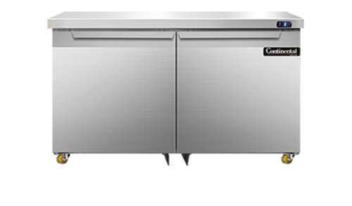 Designer Line Undercounter Freezer, 48" wide, two-section, (2) field rehingable doors, stainless steel exterior & interior, stainless steel top, 1 3/8" diameter plate casters, front breathing, electronic controller w/ digital display, rear mounted self-contained refrigeration, 1/2 hp