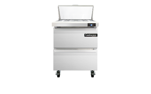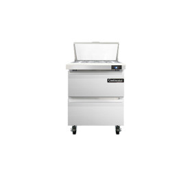 Sandwich Unit, 27" wide, one-section, (8) 1/6 size x 4" deep pans with 12" cutting board, (2) drawers, accommodates (1) 12 x 20 x 6 pan per drawer (supplied by others), stainless steel top, front and end panels, aluminum interior, 5" casters, rear mounted self-contained refrigeration, 1/5 hp