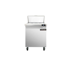 Sandwich Unit, 27" wide, one-section, (8) 1/6 size x 4" deep pans with 12" cutting board, (1) field rehingable door, stainless steel top, front and end panels, aluminum interior, 5" casters, rear mounted self-contained refrigeration, 1/5 hp