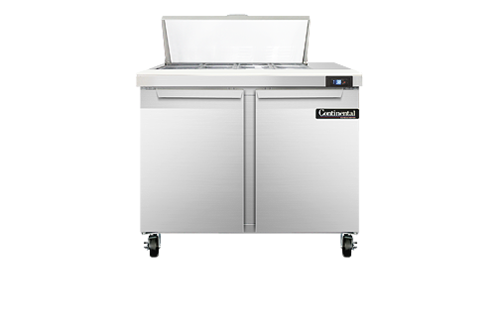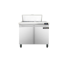 Sandwich Unit, 36" wide, two-section, (8) 1/6 size x 4" deep pans with 12" cutting board, (2) field rehingable doors, stainless steel top, front and end panels, aluminum interior, 5" casters, rear mounted self-contained refrigeration, 1/5 hp