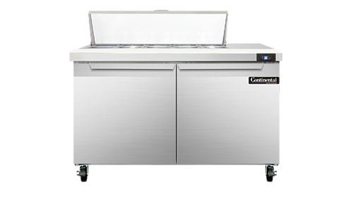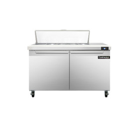 Sandwich Unit, 48" wide, two-section, (10) 1/6 size x 4" deep pans with 12" cutting board, (2) field rehingable doors, stainless steel top, front and end panels, aluminum interior, 5" casters, rear mounted self-contained refrigeration, 1/5 hp